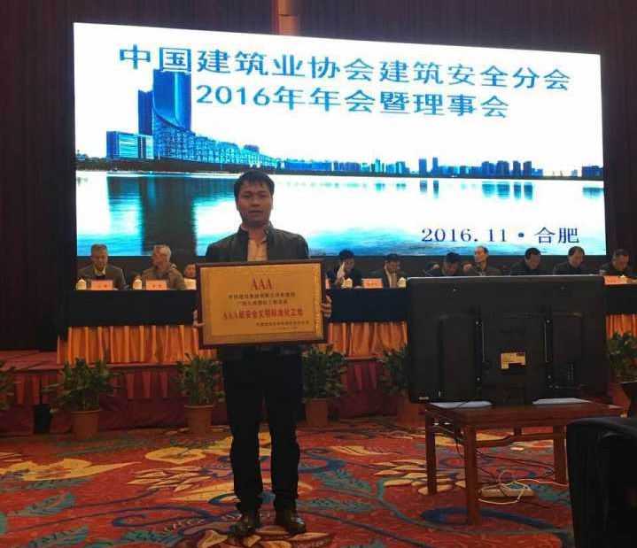 11月30日,在安徽省合肥市召開的2016年中國(guó)建筑業(yè)協(xié)會(huì)建筑安全分會(huì)年會(huì)暨理事會(huì)上傳來喜訊,由我公司負(fù)責(zé)監(jiān)理的廣西九洲國(guó)際項(xiàng)目經(jīng)過項(xiàng)目全體同志的共同努力,項(xiàng)目順利被中國(guó)建筑業(yè)協(xié)會(huì)評(píng)選為“國(guó)家AAA級(jí)安全文明標(biāo)準(zhǔn)化工地”!