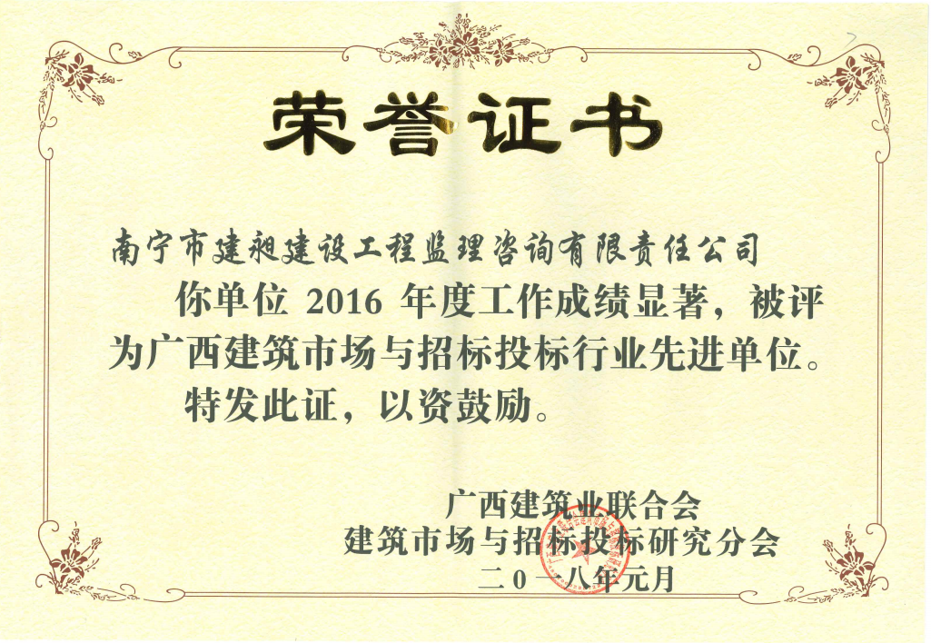 熱烈祝賀我公司再次榮獲“廣西建筑市場(chǎng)與招標(biāo)投標(biāo)行業(yè)先進(jìn)單位”榮譽(yù)稱(chēng)號(hào),從2011年起已連續(xù)6年榮獲此殊榮。同時(shí)還有3位同志榮獲“廣西招標(biāo)投標(biāo)代理機(jī)構(gòu)先進(jìn)個(gè)人”稱(chēng)號(hào),向他們表示祝賀。